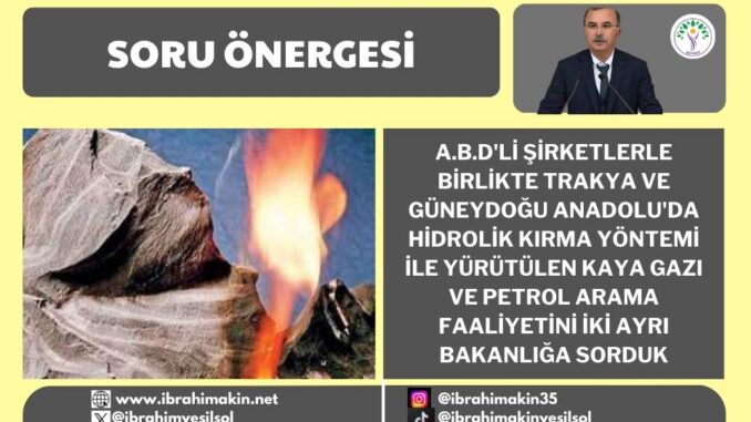 A.B.D’Lİ ŞİRKETLERLE BİRLİKTE TRAKYA VE GÜNEYDOĞU ANADOLU’DA HİDROLİK KIRMA YÖNTEMİ İLE YÜRÜTÜLEN KAYA GAZI VE PETROL ARAMA FAALİYETİNİ İKİ AYRI BAKANLIĞA SORDUK
